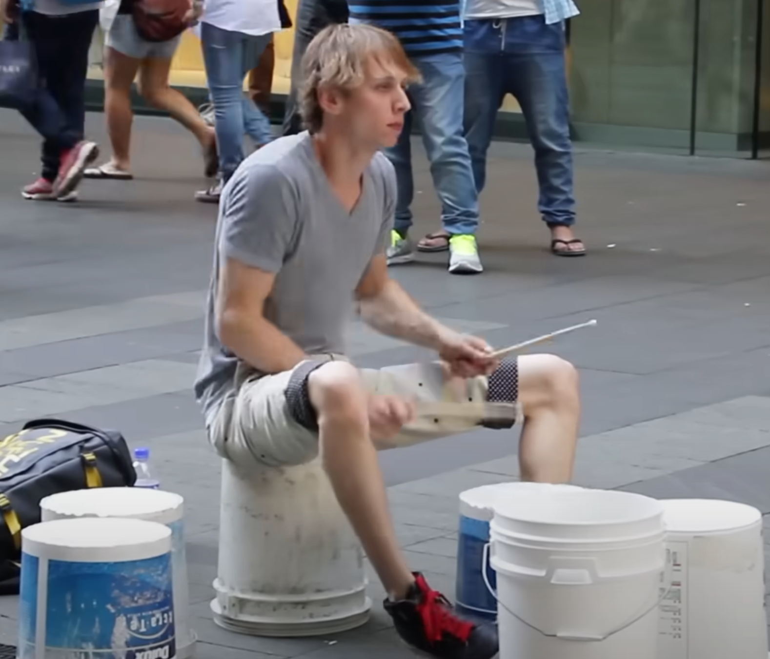 In a busy city street, a lone man sat quietly on an old, worn bucket, surrounded by a few more plastic pails arranged like a drum set. His clothes were simple, his appearance a little rough, and for a while, nobody really noticed him. People passed by, lost in their own worlds, barely giving him a second glance.