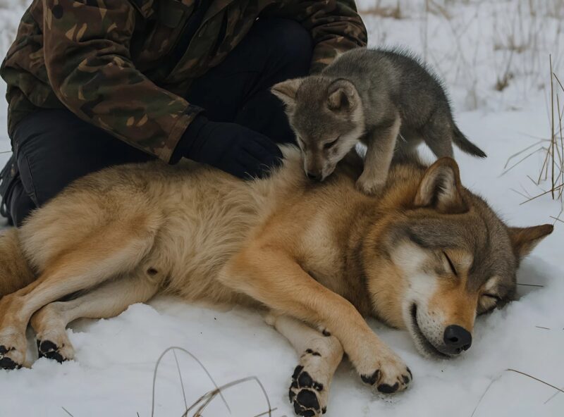 When he noticed that the wolf was not moving, he was ready to back off, turn around, and flee. Just a tiny puppy whimpered, rubbed its muzzle against its mother’s side, and attempted to lick her as it circled about.