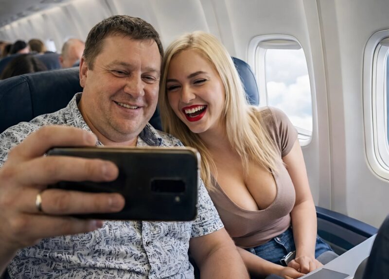 He was sitting on the plane. Happy. A huge smile. Beside him — a young woman, our assistant. He was kissing her on the cheek, and she was laughing.