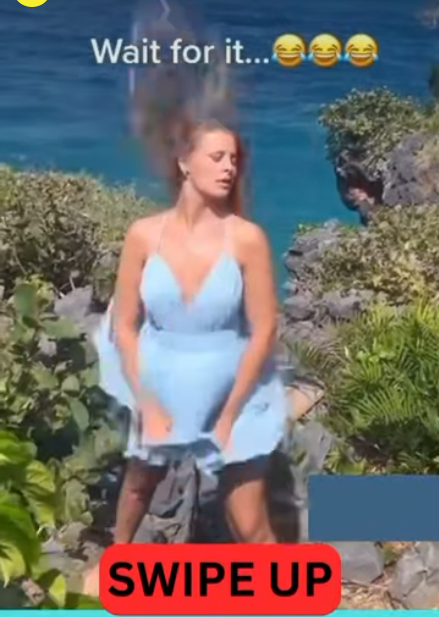 In this hilarious “Wait for it…” moment, a woman tries to capture a serene, breezy shot by the ocean. She’s got the flowy blue dress, the stunning cliffside backdrop, and the perfect pose. But as any seasoned traveler knows, the ocean breeze isn’t always a gentle fan—sometimes it’s a high-powered wind tunnel.