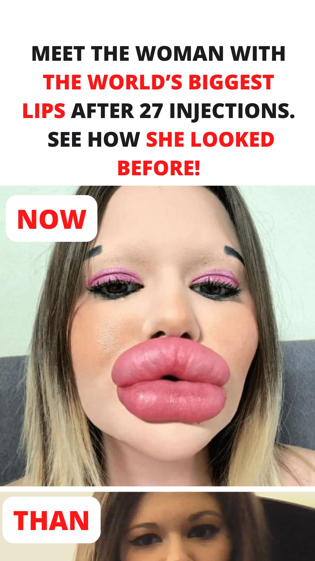 Andrea started a series of hyaluronic acid injections in an attempt to reach her maximum lip goals. Her lips have quadrupled in size as a result of the 27 operations she has had to date. Even after spending more than $5,000 on lip enhancement, Andrea is still not happy and longs for even bigger lips. Andrea is adamant about being the person with the biggest lips in the world, even if medical professionals are against any additional procedures.