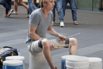 In a busy city street, a lone man sat quietly on an old, worn bucket, surrounded by a few more plastic